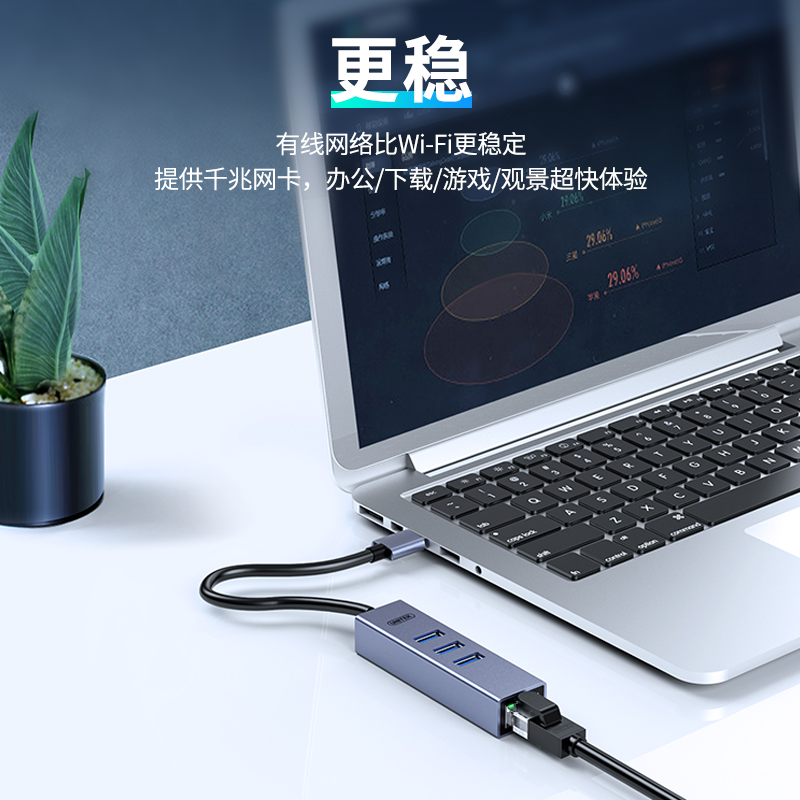 - Bộ chuyển đổi UNITEK Y-3083Q tích hợp 3 cổng USB 3.0 và 1 cổng LAN Gigabit, giúp mở rộng kết nối USB đồng thời bổ sung khả năng truy cập mạng có dây ổn định.
