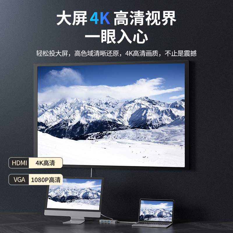 - Hỗ trợ 7 cổng: HDMI (4K@30Hz), VGA, 3 x USB 3.0, RJ45 Gigabit, PD 100W.