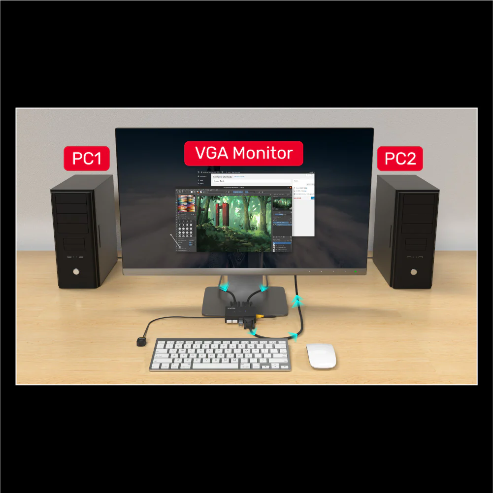 - Chia sẻ cùng lúc một màn hình VGA và 3 cổng USB (chuột, bàn phím, thiết bị USB khác).