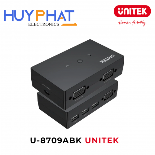 - Bộ chuyển mạch KVM VGA UNITEK U-8709ABK cho phép chia sẻ một màn hình VGA và ba cổng USB để điều khiển 2 máy tính hoặc TV Box cùng lúc.