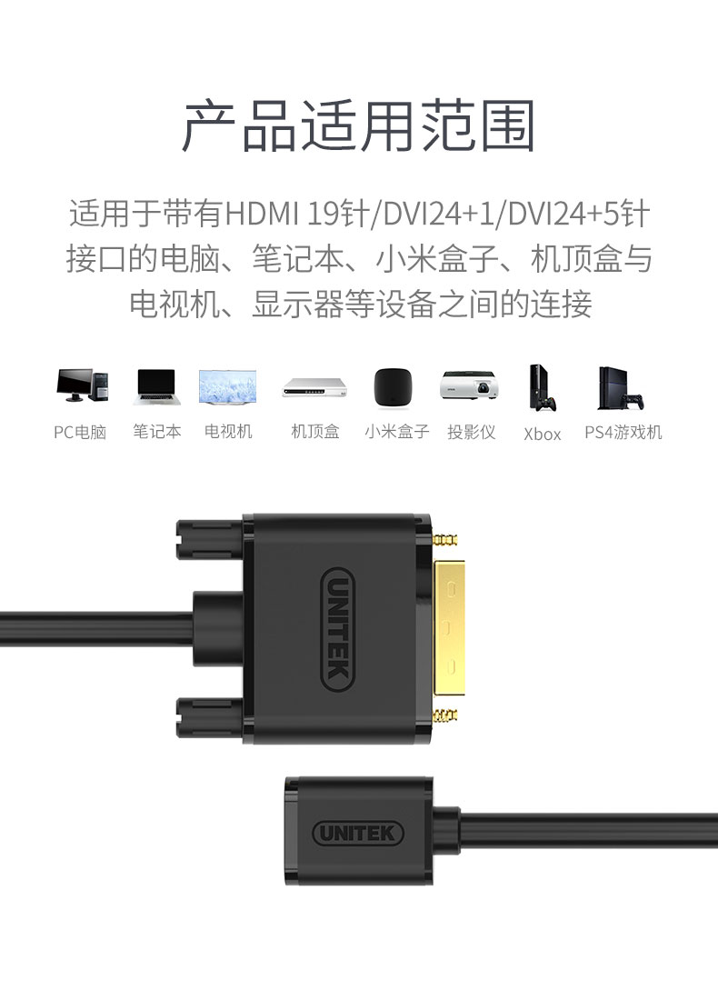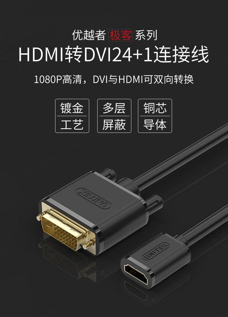 - Cáp chuyển đổi UNITEK Y-C249BK cho phép kết nối giữa HDMI và DVI, hỗ trợ chuyển đổi hai chiều giữa HDMI (F) và DVI (M).