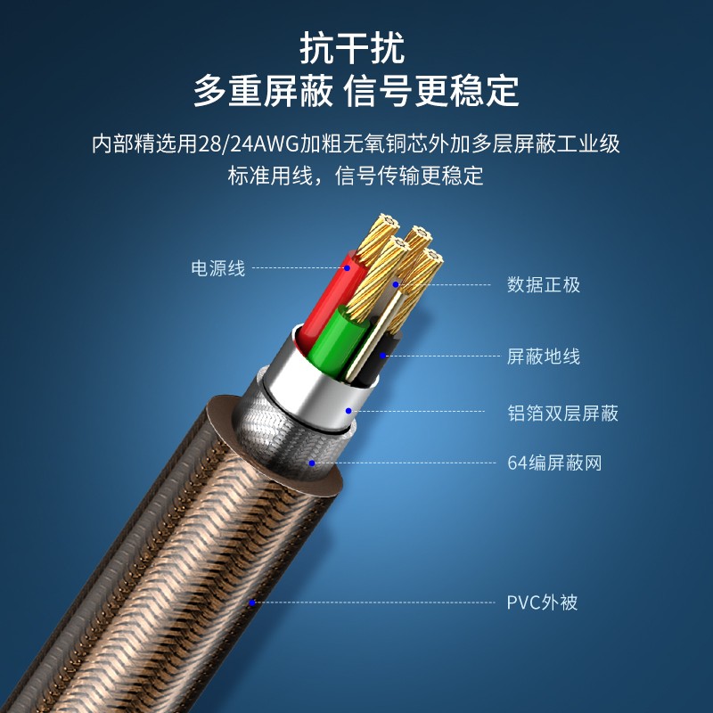 - Thiết kế chắc chắn với lõi đồng nguyên chất, lớp chống nhiễu kép (nhôm + lưới kim loại), vỏ ngoài bằng nhựa ABS bền bỉ.