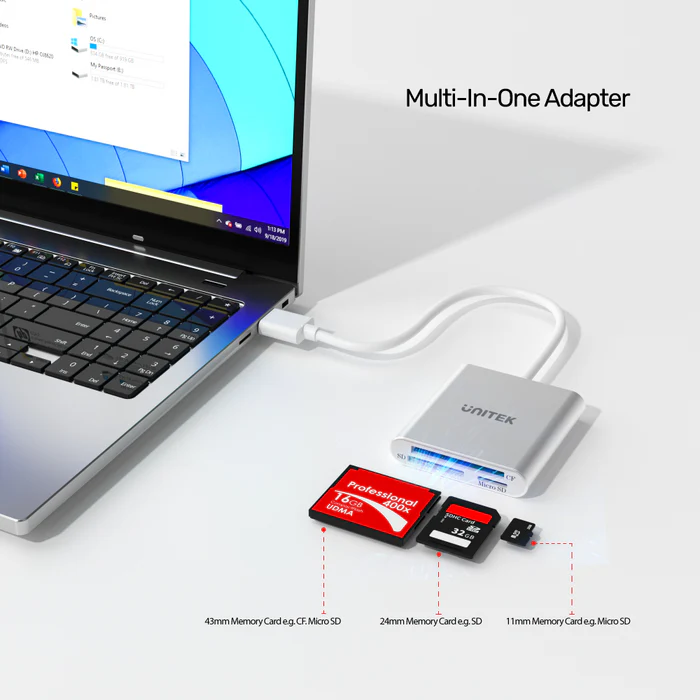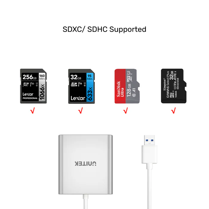 - Đầu đọc thẻ UNITEK Y-9313 hỗ trợ đọc đồng thời các loại thẻ CF, SD và MicroSD – lý tưởng cho thẻ nhớ máy ảnh và thiết bị lưu trữ.