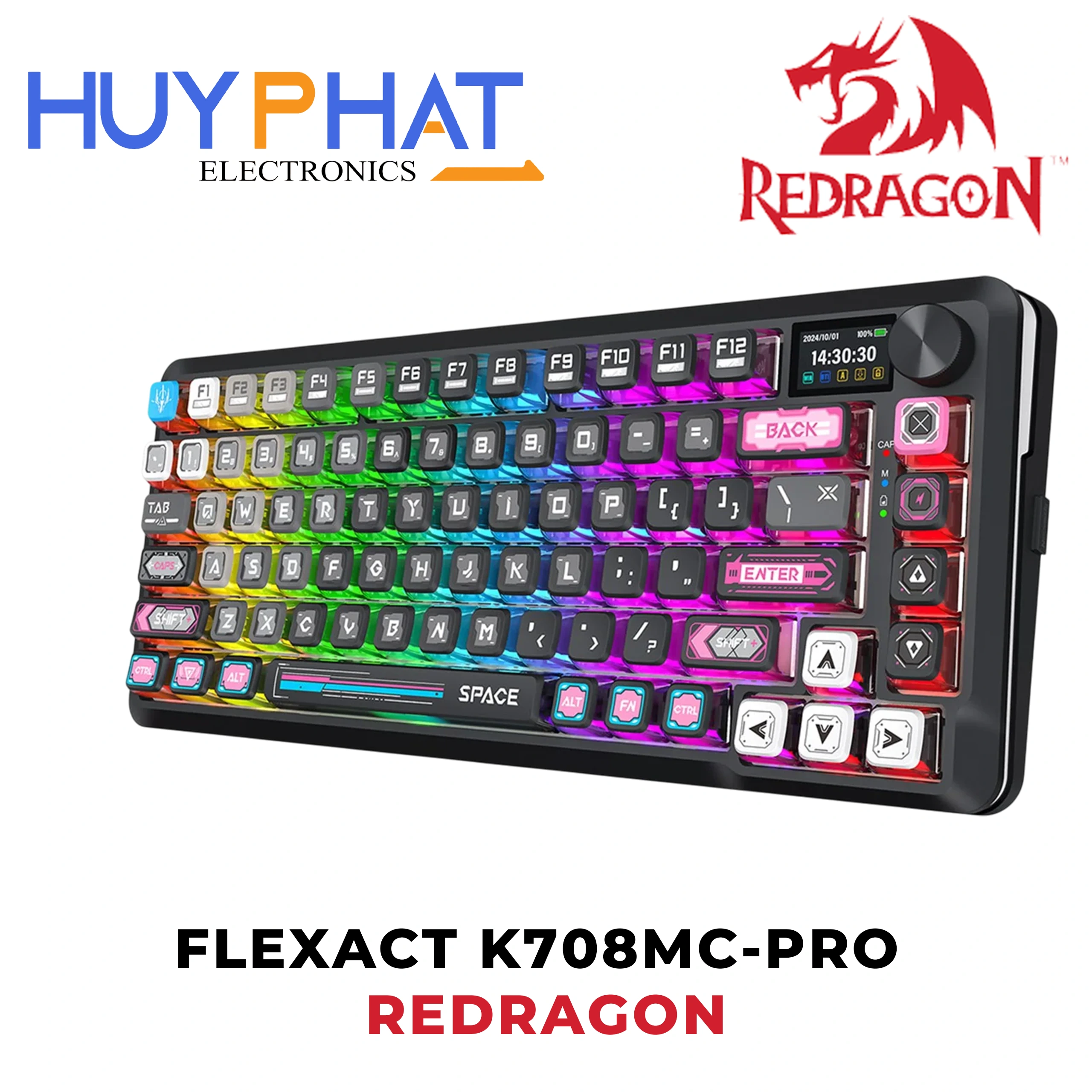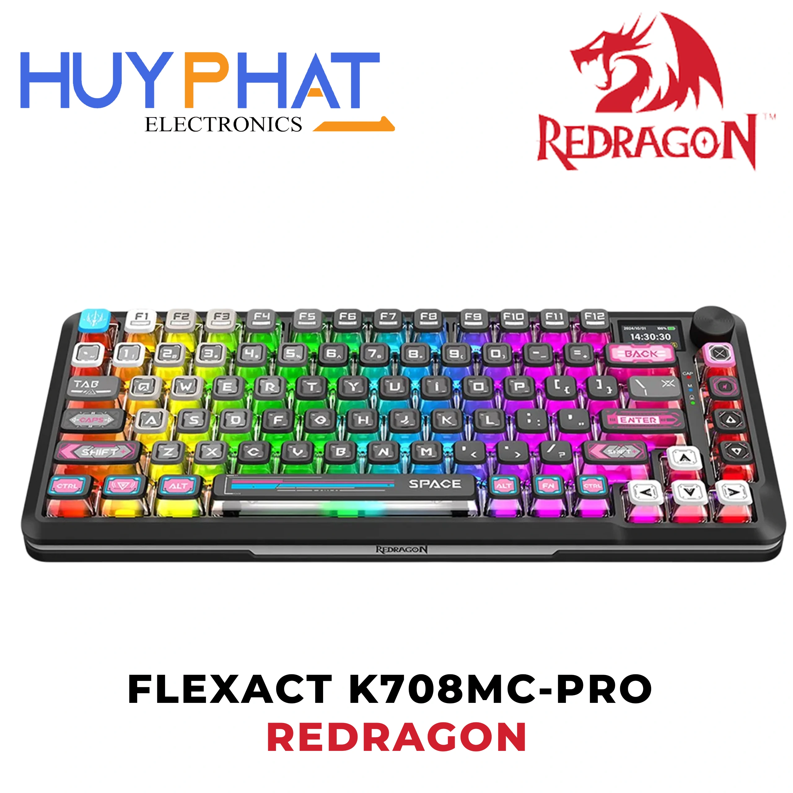 Bàn phím cơ Redragon K708MC mang thiết kế hiện đại với màn hình TFT 1,14" và núm điều khiển đa năng giúp bạn theo dõi trạng thái (kết nối, pin, hiệu ứng ánh sáng…) và điều chỉnh dễ dàng chỉ với một thao tác tay. Hỗ trợ kết nối ba chế độ linh hoạt: wired (USB-C), wireless 2.4 GHz và Bluetooth — lý tưởng cho đa thiết bị (máy tính, máy chơi game, tablet, điện thoại…).