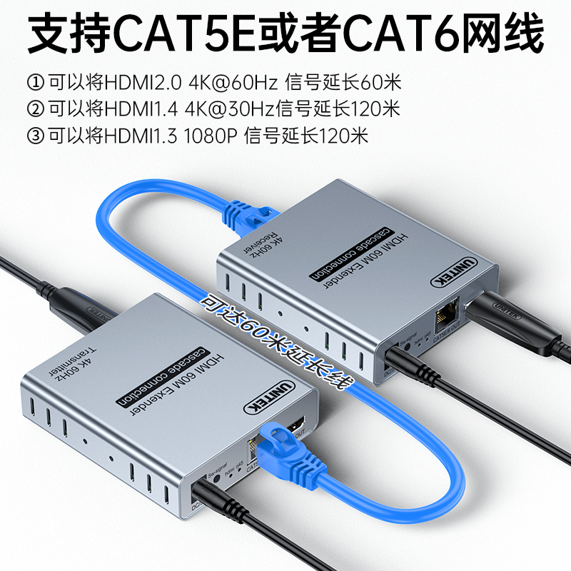 - Mở rộng tín hiệu HDMI lên đến 60 mét ở độ phân giải 4K@60Hz qua cáp Cat5e/6/7.