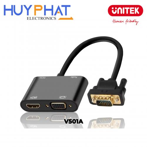- Bộ chuyển đổi UNITEK V501A cho phép kết nối thiết bị có cổng VGA (như máy tính, laptop đời cũ) với các thiết bị hiển thị có cổng HDMI hoặc VGA.
