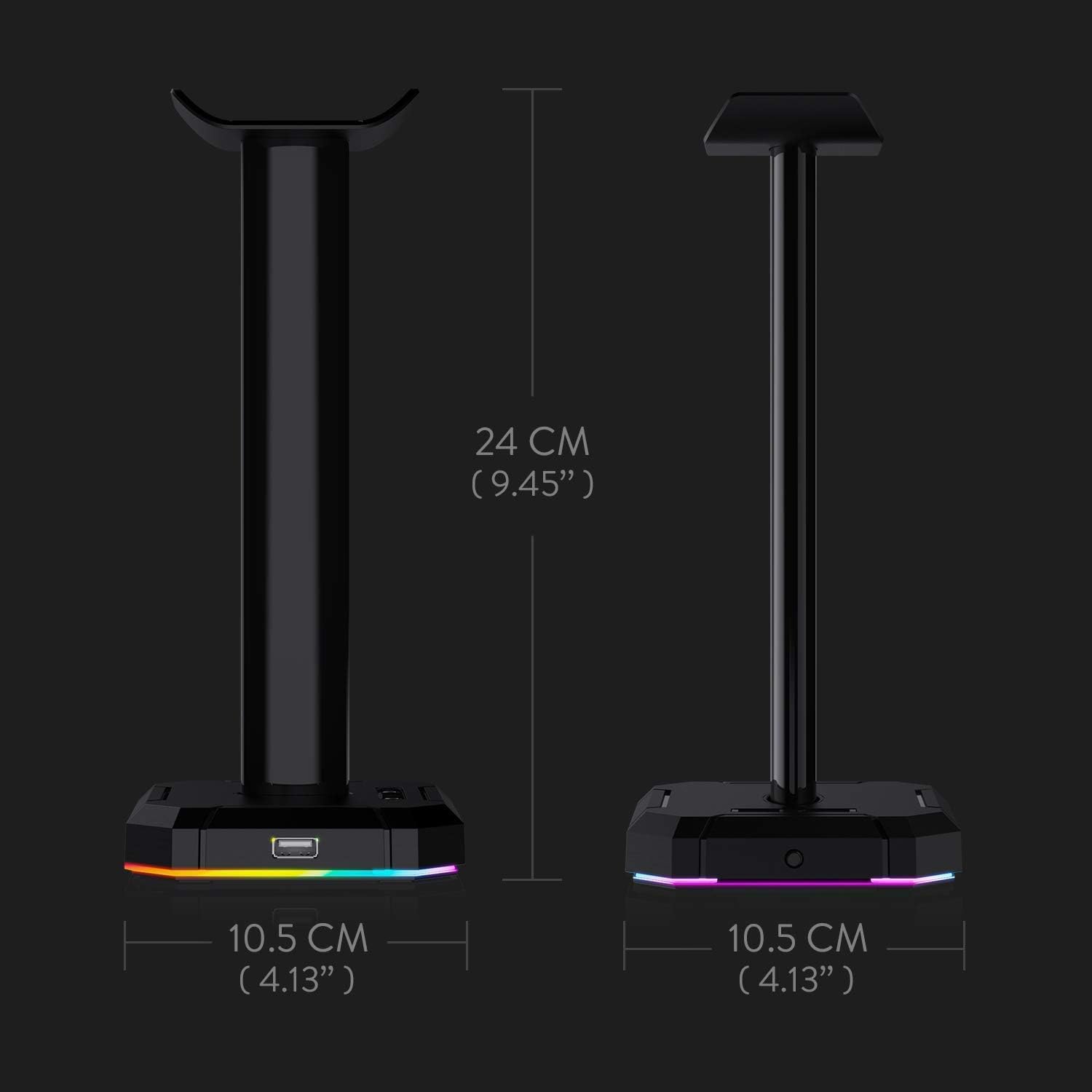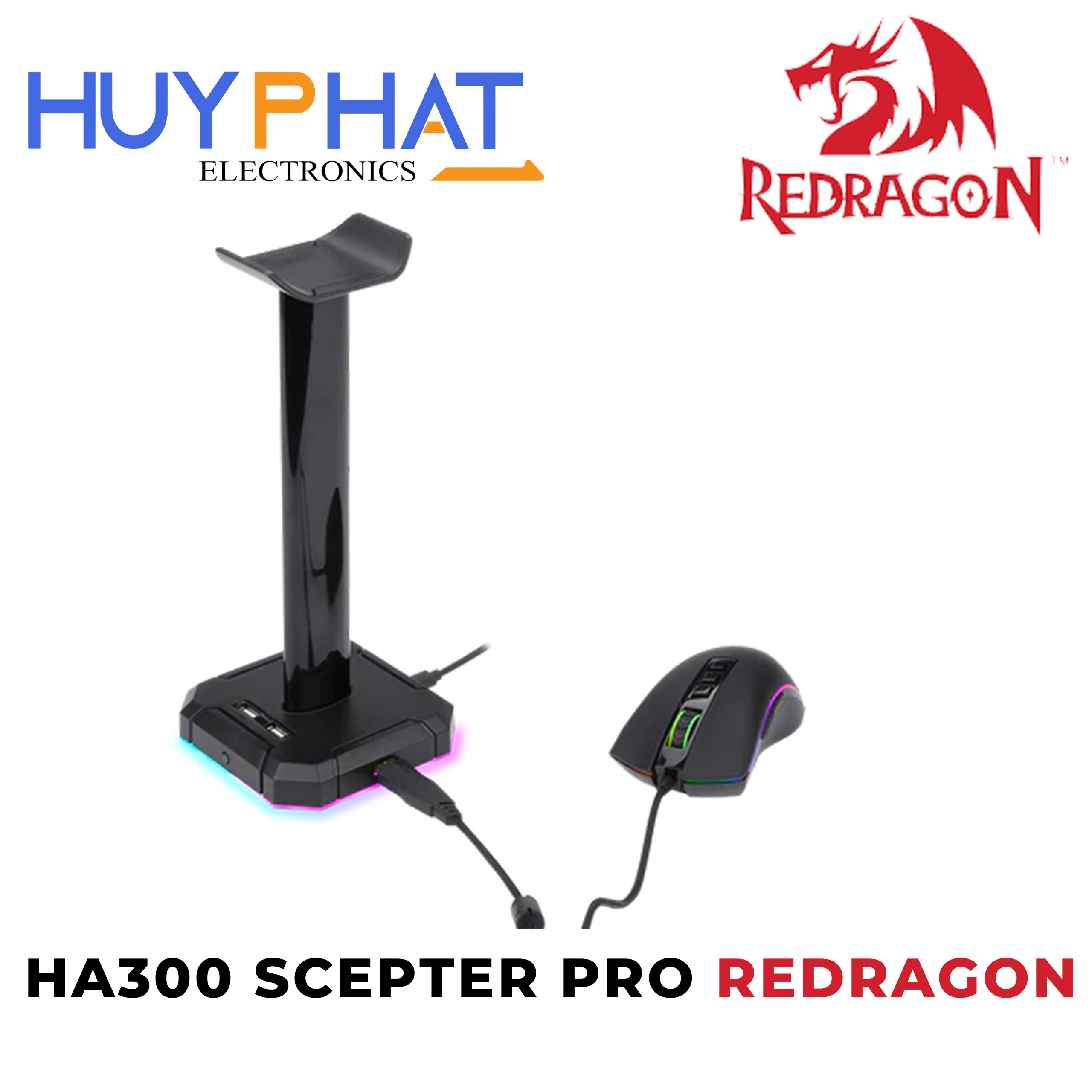 Redragon HA300 Scepter Pro là giá đỡ tai nghe gaming có đèn RGB, tích hợp 4 cổng USB 2.0 và chân đỡ bằng nhôm cao 8.5 inch, thiết kế tối giản, giúp tiết kiệm không gian bàn và tăng tính thẩm mỹ.
