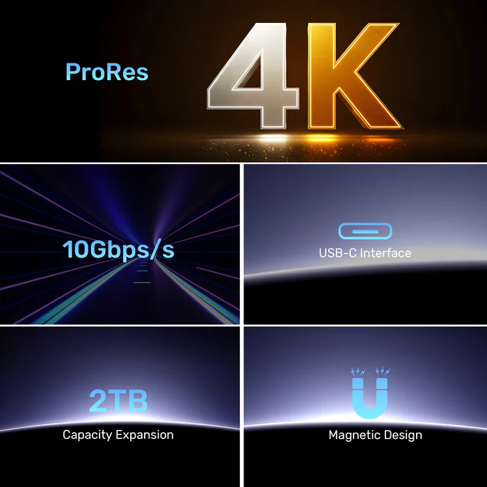 Ổ ngoại vi này hỗ trợ tốc độ truyền tải lên tới 10Gbps qua USB-C, cho phép bạn di chuyển file nặng như video 4K ProRes một cách nhanh chóng. Bên cạnh đó, hỗ trợ Power Delivery 100W giúp vừa truyền dữ liệu vừa sạc thiết bị mà không phải dùng thêm nguồn phụ.