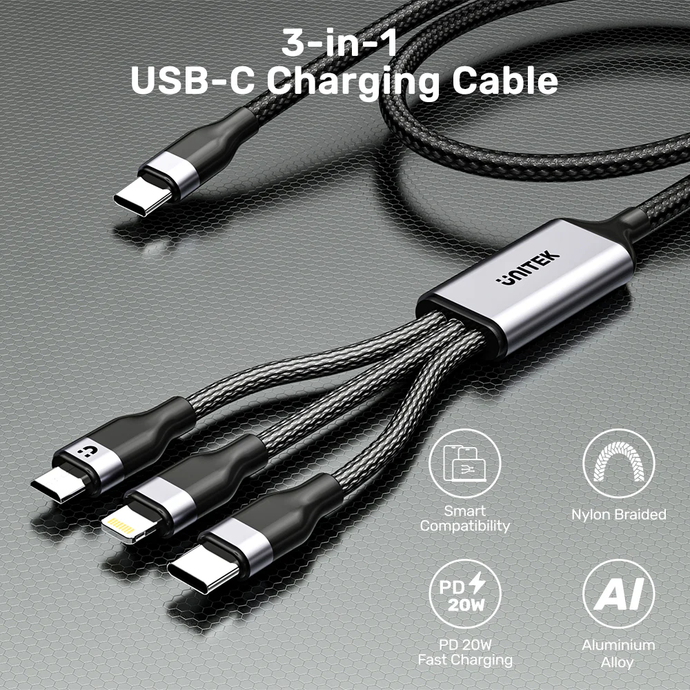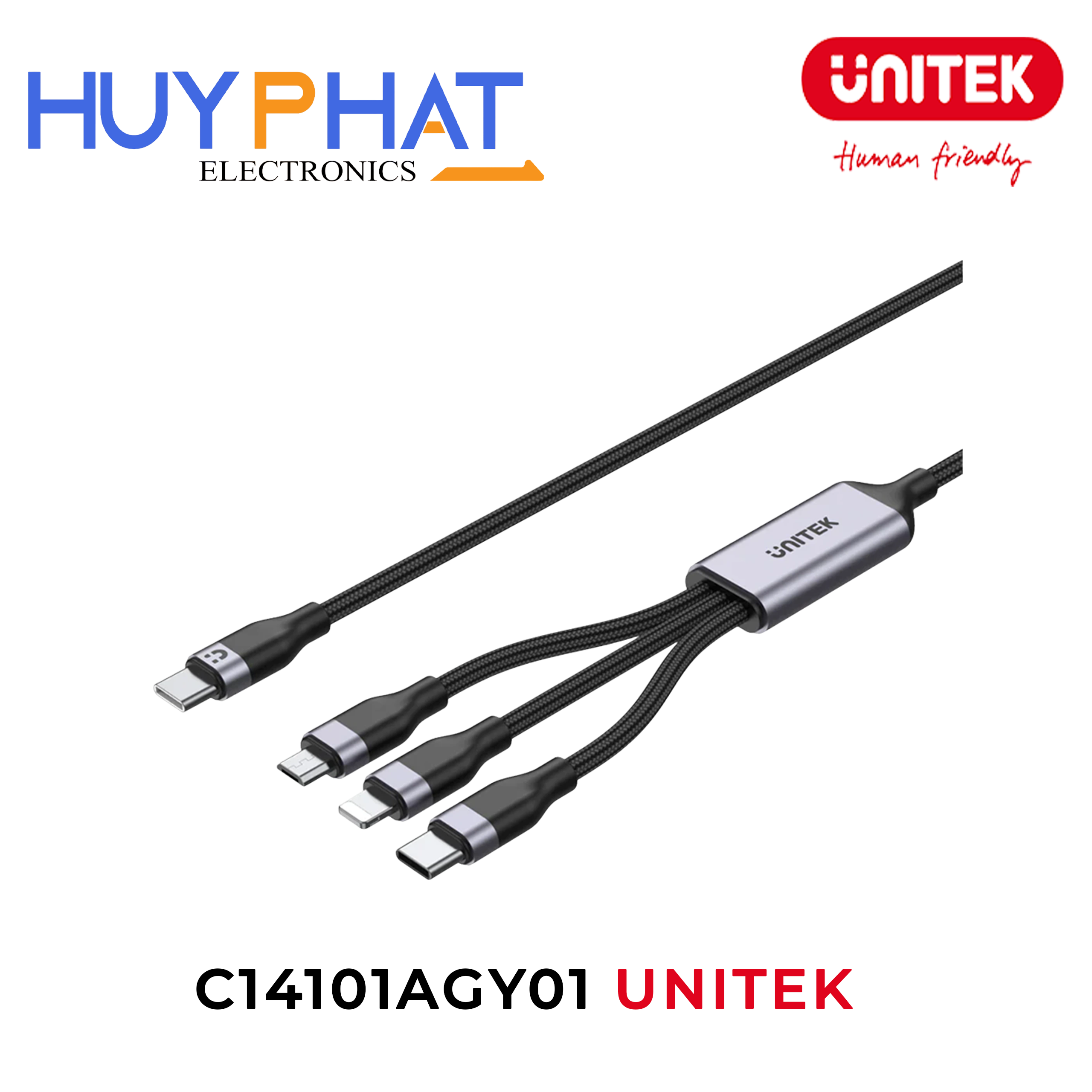 - Cáp sạc đa năng 3 trong 1 Unitek C14101AGY01-1.5M hỗ trợ nhiều thiết bị với tốc độ sạc nhanh và an toàn.